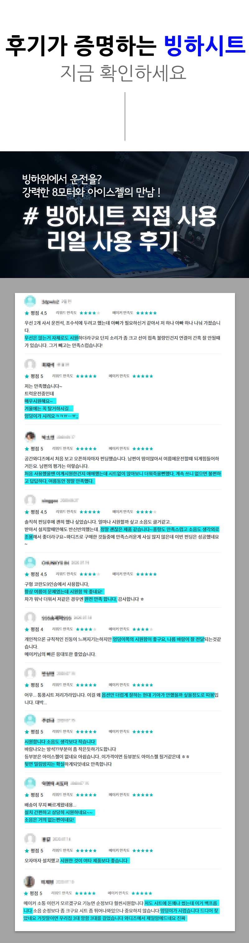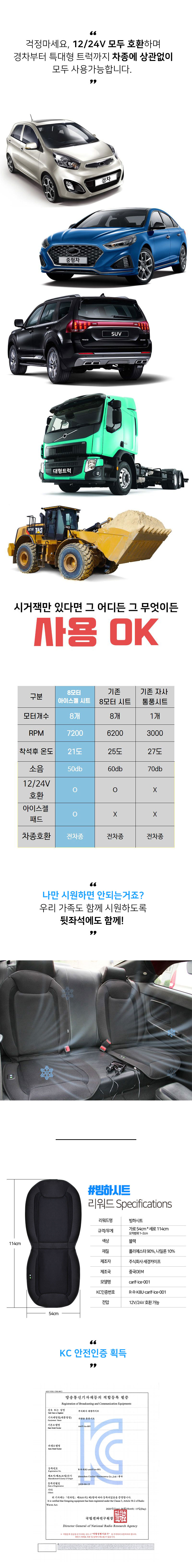 고급 통풍 시스템과 빙하 쿨링 기술을 적용해 시트 위에 앉는 순간 시원함을 즉시 느낄 수 있는 쿨링 방석! 여름철 운전 시 땀과 열을 효과적으로 차단하며, 차량 내부의 온도를 빠르게 낮춰드립니다! 고급스러운 디자인으로 차량 인테리어에도 굿! 전차종 호환 가능하여 설치가 간편!