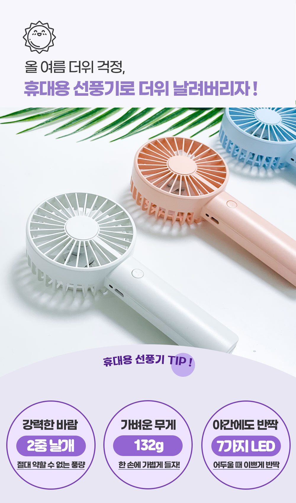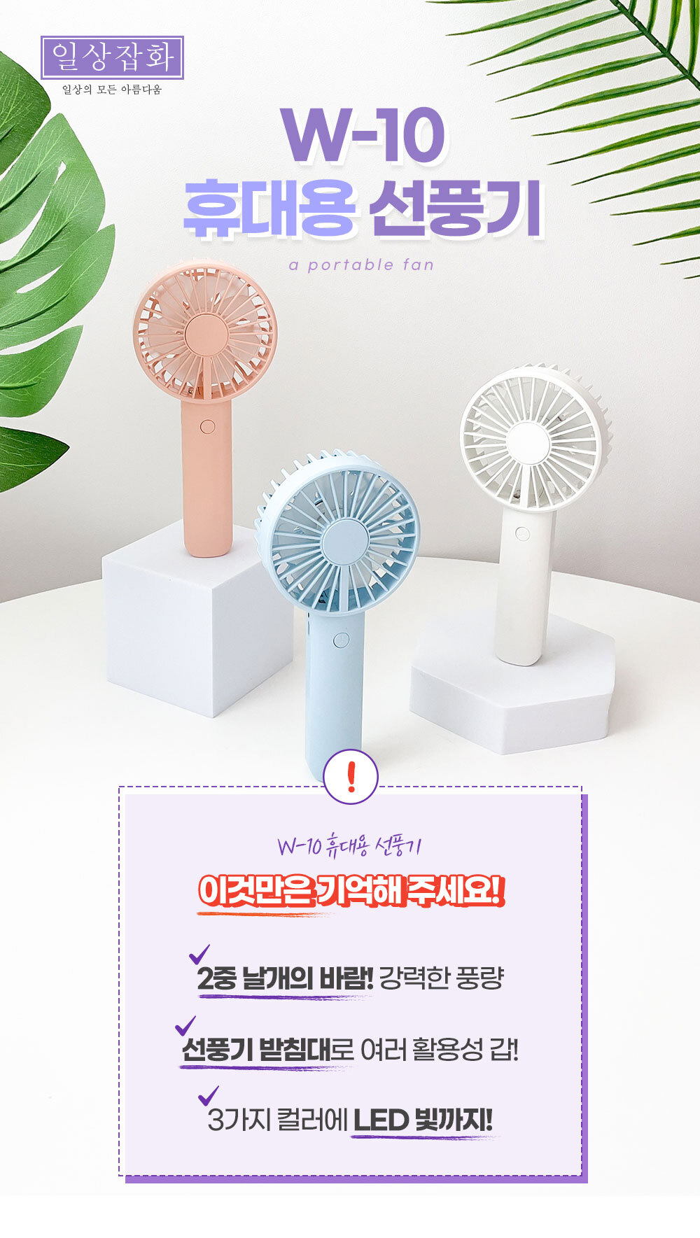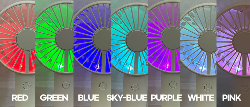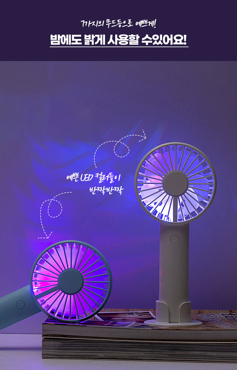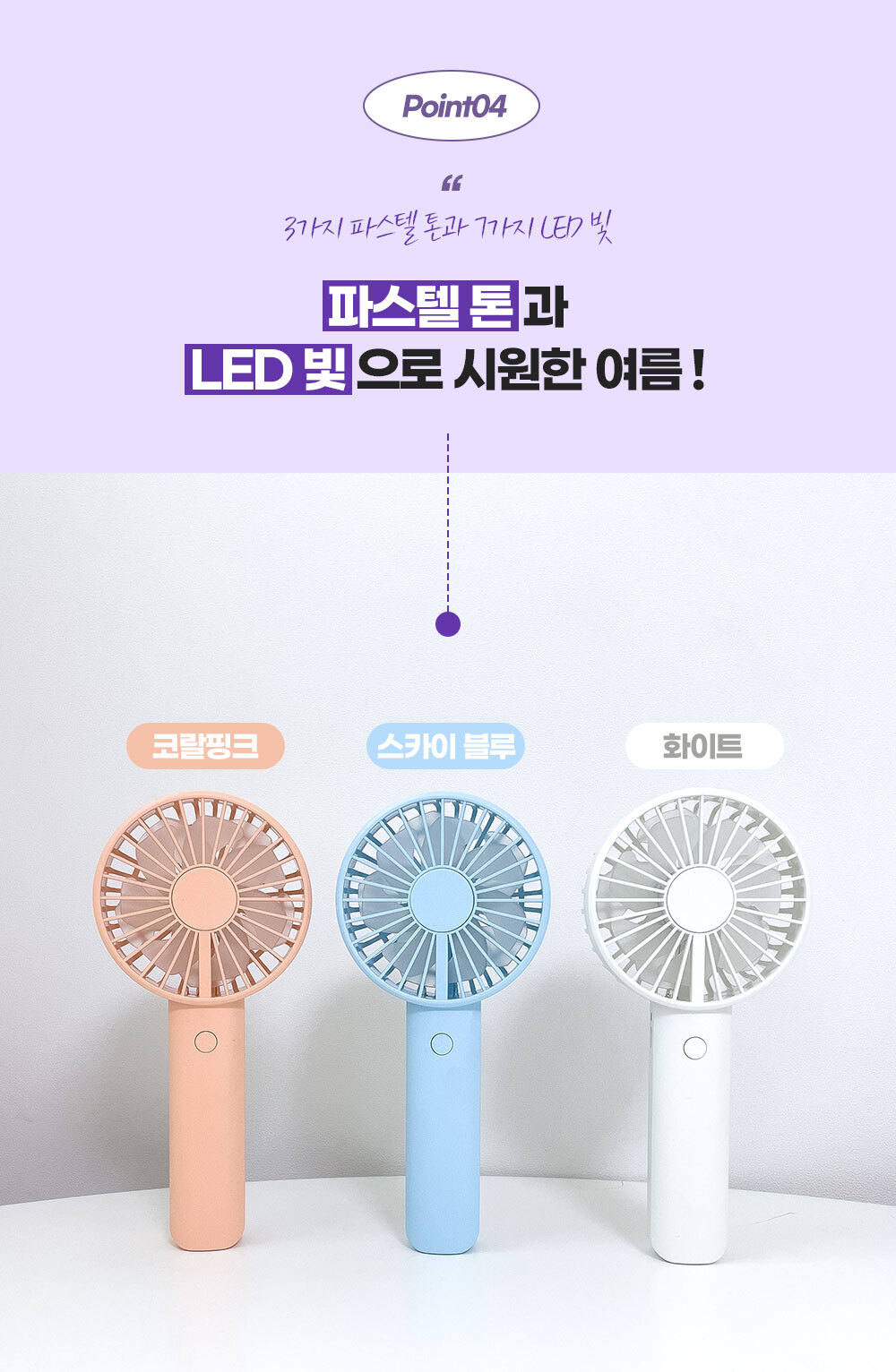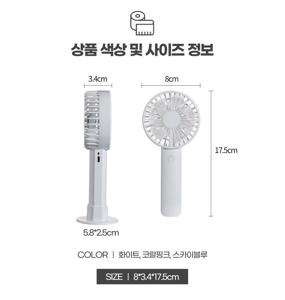 거치대가 포함되어 있어 탁상용으로도 캠핑용으로도 가능한 파스텔톤의 코랄핑크 스카이블루 화이트 색상에 LED 조명까지 포함된 무소음 휴대용 핸디 선풍기
