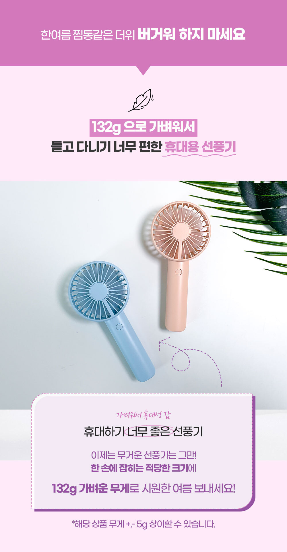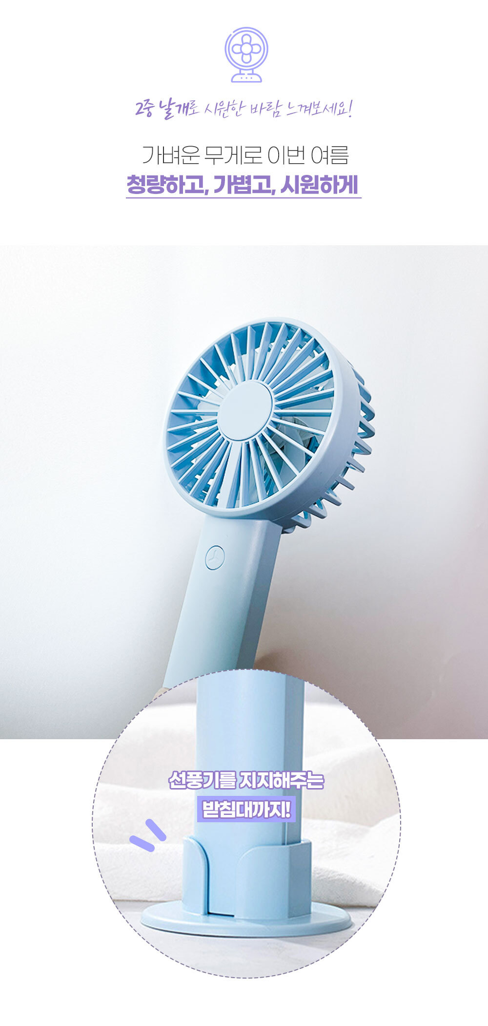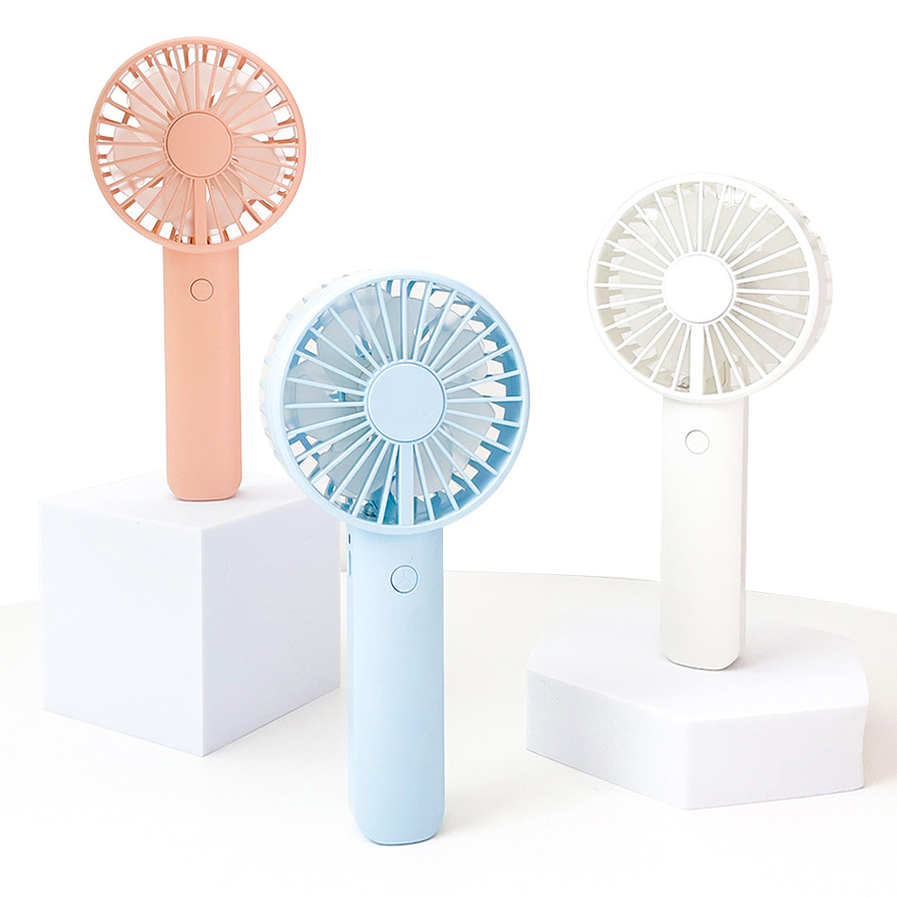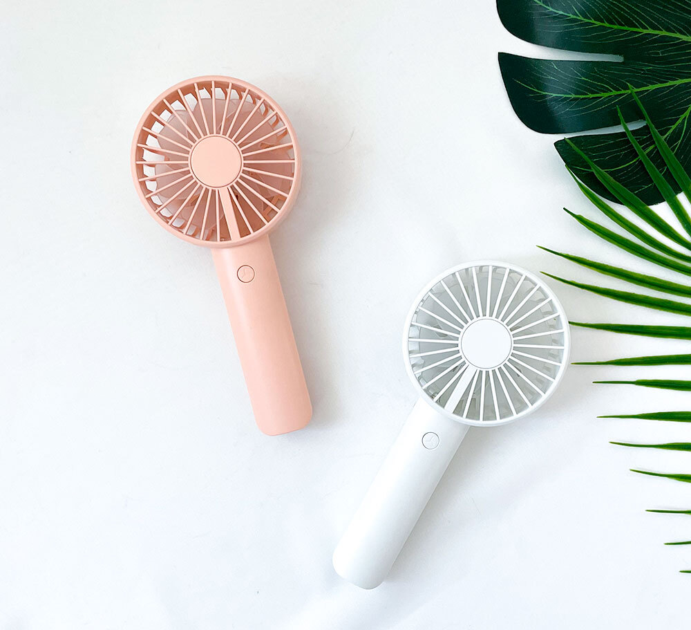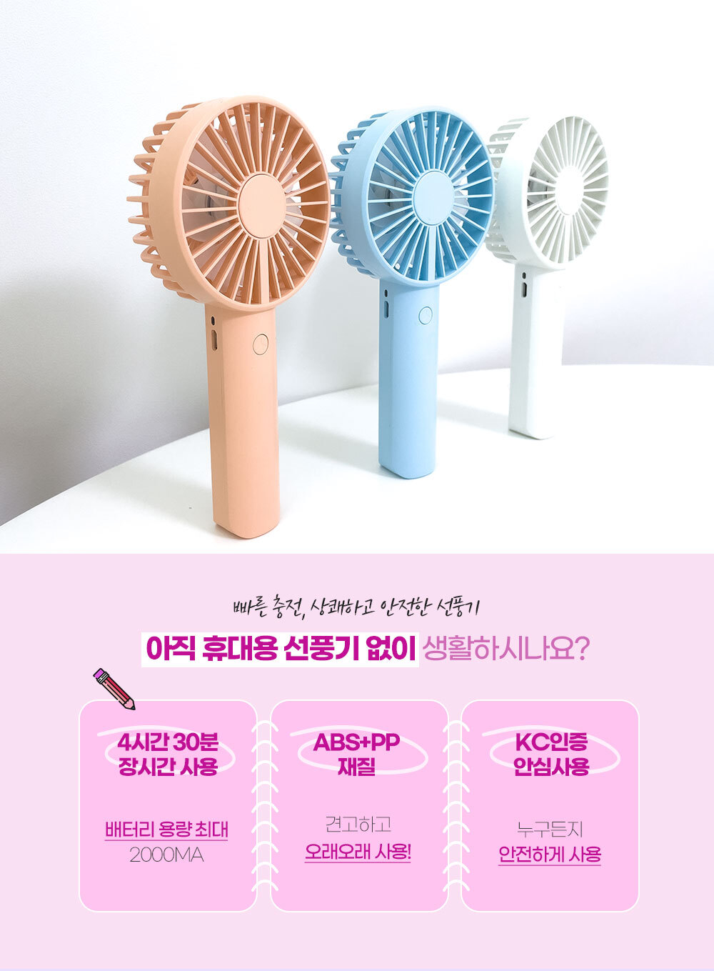 거치대가 포함되어 있어 탁상용으로도 캠핑용으로도 가능한 파스텔톤의 코랄핑크 스카이블루 화이트 색상에 LED 조명까지 포함된 무소음 휴대용 핸디 선풍기