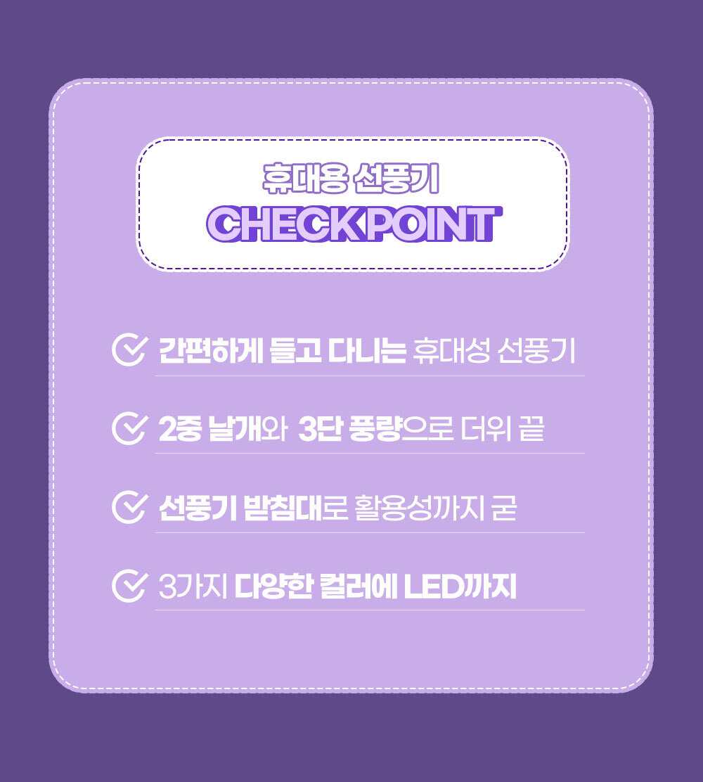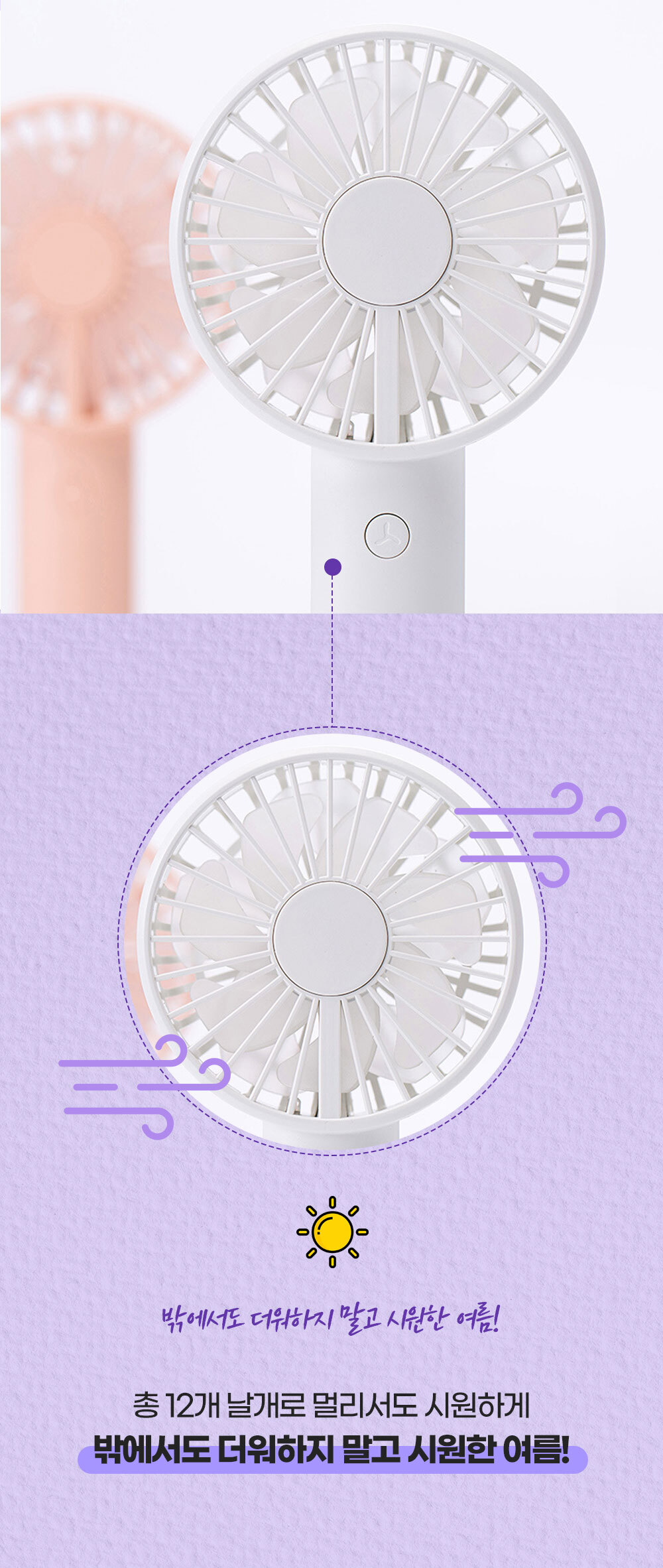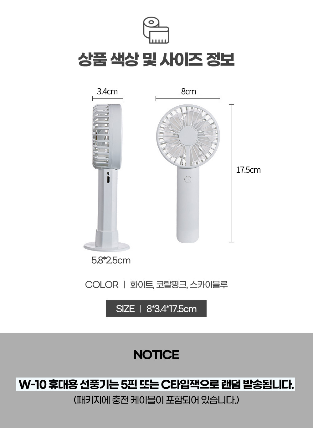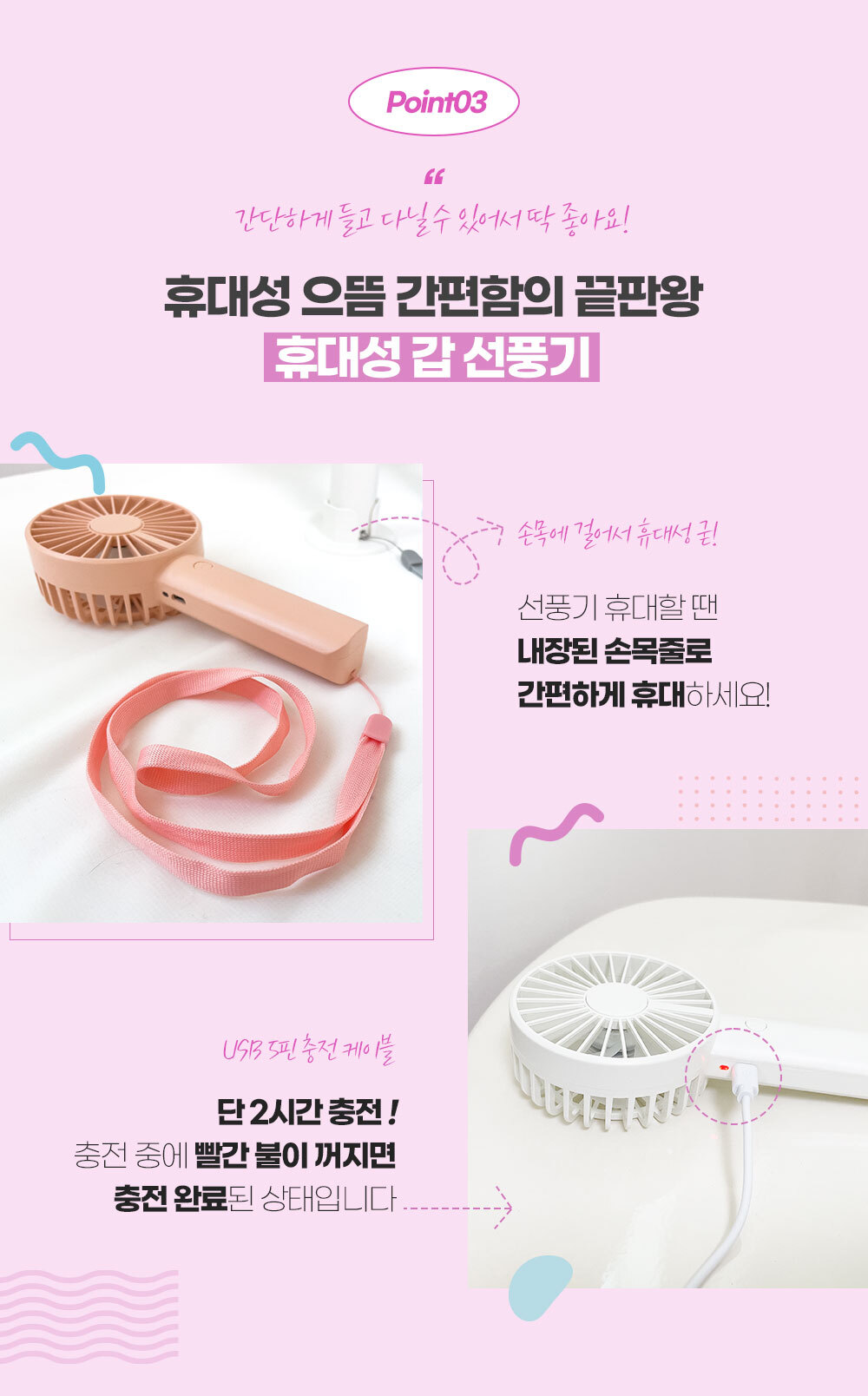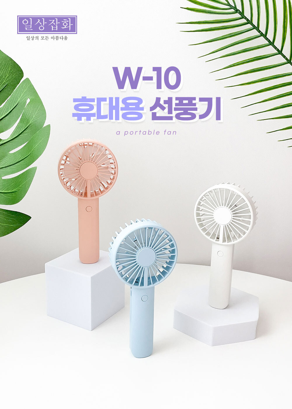 거치대가 포함되어 있어 탁상용으로도 캠핑용으로도 가능한 파스텔톤의 코랄핑크 스카이블루 화이트 색상에 LED 조명까지 포함된 무소음 휴대용 핸디 선풍기