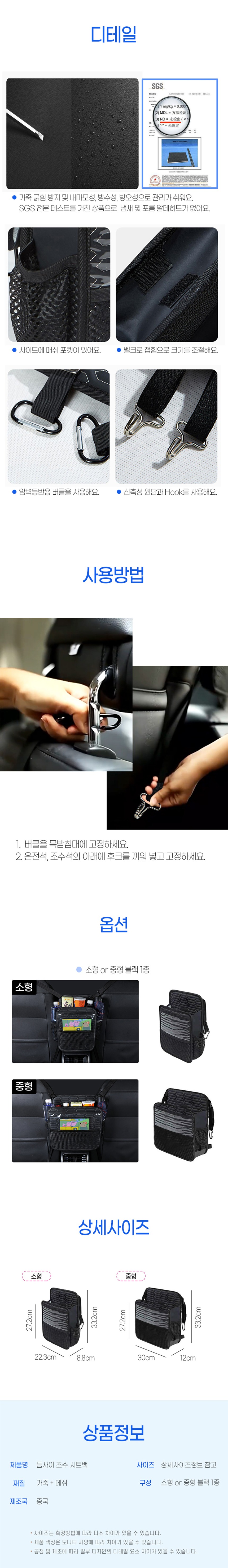 차량용 전차종 수납 조수 시트백 자동차 뒷자석 틈새 정리함 포켓 소형 중형