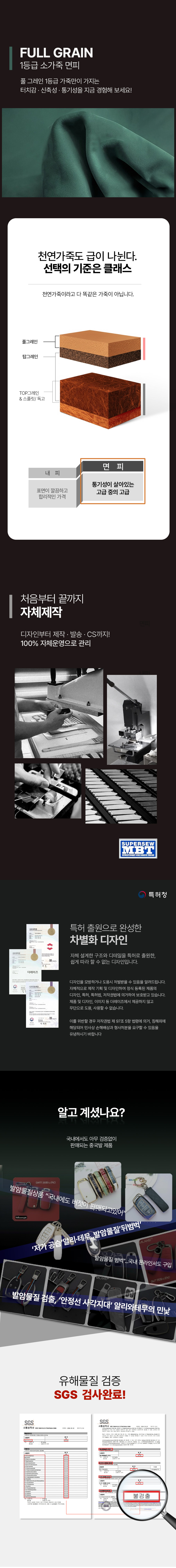 풀그레인 소가죽 면피를 사용한 차 키케이스로, 사용하면 할수록 윤기가 나고, 부드러운 터치감과 신축성 및 통기성이 뛰어나 사계절 쾌적하게 사용 가능합니다.